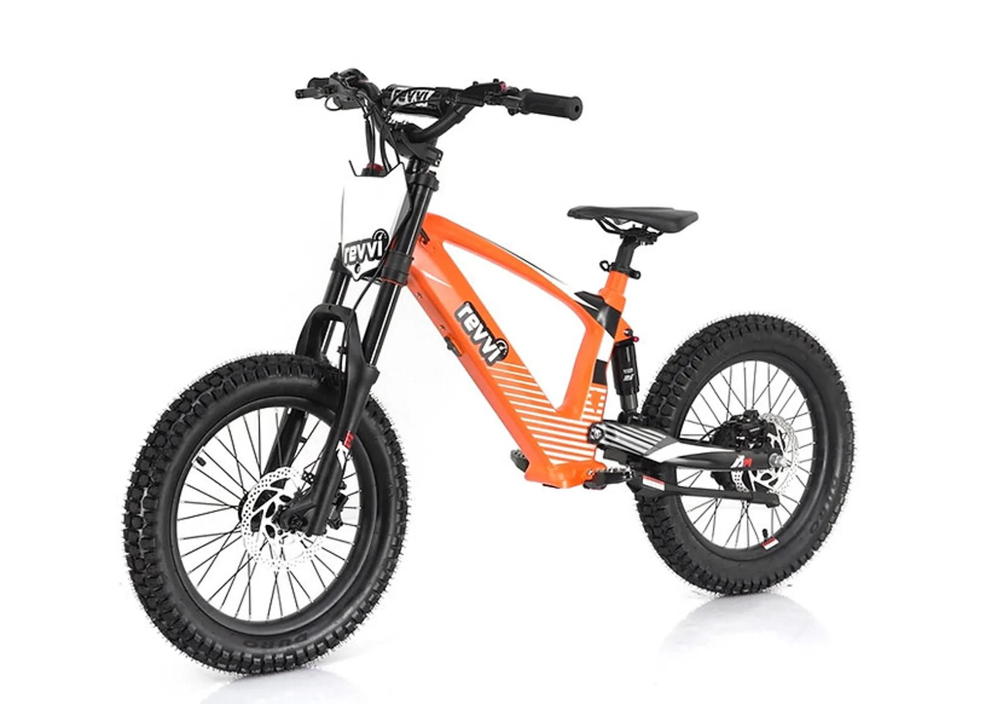 Revvi 18", electric balance bike, kids e-bike, lightweight frame, 500W hub motor, off-road tires, hydraulic disc brakes, front and rear suspension, adjustable speed settings, twist throttle, rechargeable battery, durable design, youth electric bike.