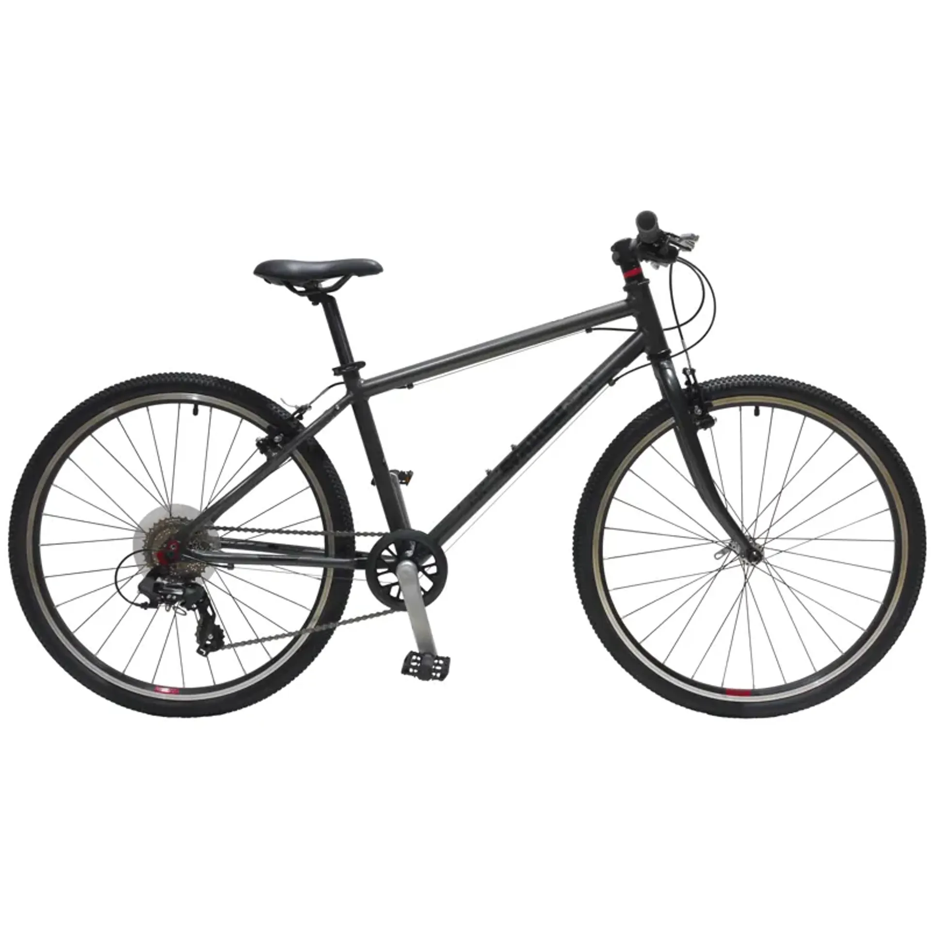 With 152mm cranks, 32T chainring and Shimano 8spd 11-32T cassette, there's enough gear ratio's to get up most hills when powered on sweets, and enough low gears to race back down. The double-wall alloy rims, powerful alloy v-brakes and robust triple butted frame ensure weight is kept to a minimum, but ensures performance is second to none!